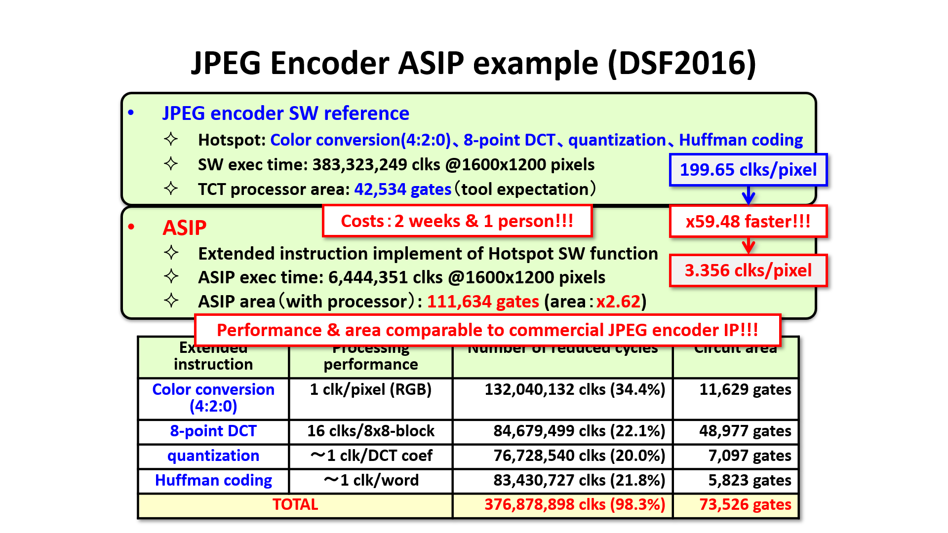 3層の畳み込みニューラルネットワークによる画像の超高解像度化において,C2RTLにより2ステージのパイプラインと8032個の積和演算器をもつプロセッサを作成し,150MHzの動作周波数で2.4TeraOPS/secの動作速度を達成しました.またJPEGエンコーダにおいては1人の人員でわずか2週間で商用IPに匹敵するエンコーダを作成できました.